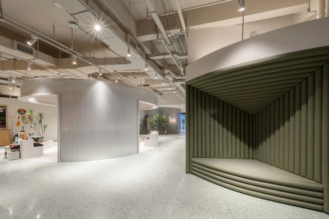 青山從濕地的線條和包裹式的形態(tài)中汲取靈感,塑造出整體空間形態(tài)。整個(gè)空間用曲線包裹功能空間,形成多個(gè)“功能泡泡”。通過不同材料和形態(tài)的運(yùn)用,賦予每個(gè)空間獨(dú)特的特性,暗合濕地的空間特點(diǎn);柔和曲折的動(dòng)線讓參觀者宛若漫步濕地,還原了一種移步異景的探索之感。