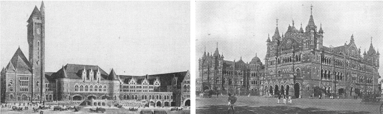 從左向右、從上向下依次為:圣路易斯聯(lián)合車站一側(cè)單鐘塔、英國國王十字車站單鐘塔居中、印度孟買維多利亞總站對稱雙鐘塔、法蘭克福中央車站弱化鐘塔