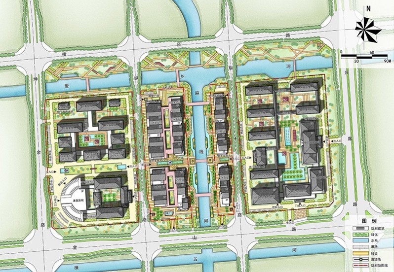 項(xiàng)目位于揚(yáng)州市樸席鎮(zhèn),樸席中部片區(qū)一期規(guī)劃范圍內(nèi),其四至范圍為∶東起興席路,南臨金山路,西至坤余路,北靠橫四路,總建筑面積12.79萬(wàn)平方米。以綠為基、以水為脈、以文為韻,并結(jié)合揚(yáng)州以及樸席地方建筑及文化特色,將公共建筑融入傳統(tǒng)元素,體現(xiàn)樸席禪宗文化、水鄉(xiāng)文化和席鄉(xiāng)小鎮(zhèn)特色,塑造現(xiàn)代文明與古代文化交相輝映的揚(yáng)派席風(fēng)建筑風(fēng)格。結(jié)合濱河步道、城市休閑綠道,串聯(lián)各城市生態(tài)休憩節(jié)點(diǎn),構(gòu)成完整的健康活力環(huán)。依托麻線河兩側(cè)濱水商業(yè)街,打造公共服務(wù)休閑軸;根據(jù)功能分區(qū)特征,依托橫向景觀聯(lián)系,打造各功能聯(lián)系發(fā)展軸。規(guī)劃依托北側(cè)愛(ài)香河及公共綠地打造富有地方特色的濱河景觀廊道;依托南側(cè)城市綠帶,打造富有生機(jī)活力的城市休閑廊。形成康養(yǎng)服務(wù)片區(qū)、商業(yè)服務(wù)片區(qū)和醫(yī)療服務(wù)片區(qū)。