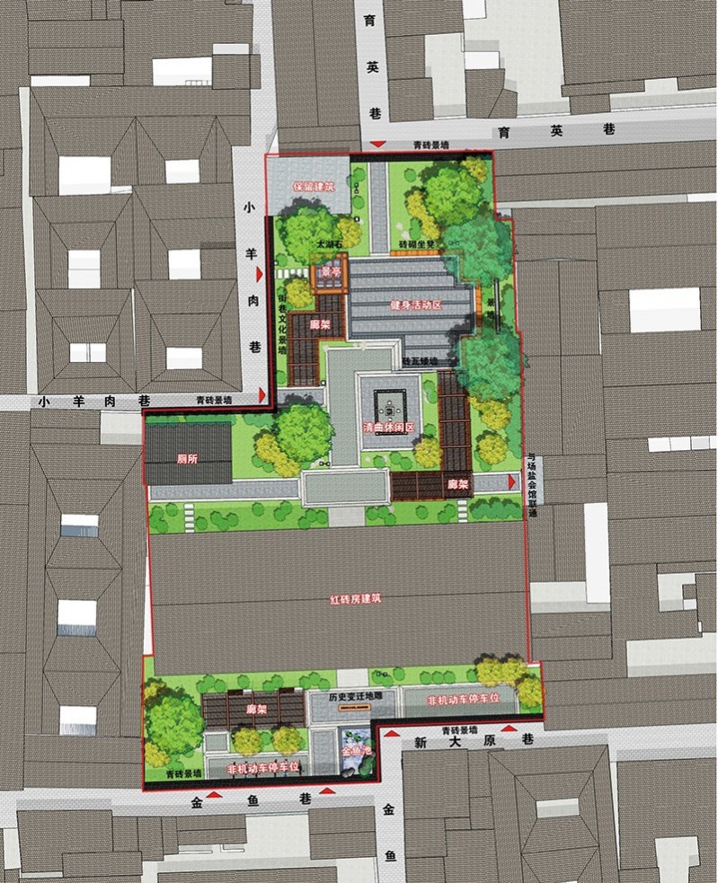 項(xiàng)目位于老城區(qū)南河下歷史文化街區(qū)板塊內(nèi),蘇唱街南側(cè)育英巷盡頭,西側(cè)隔羊肉巷為王氏民居,東側(cè)緊靠場鹽會館,南側(cè)隔金魚巷為陀林。設(shè)計(jì)范國南北長約60米,東西寬約35米,規(guī)劃總面積為1372平方米。